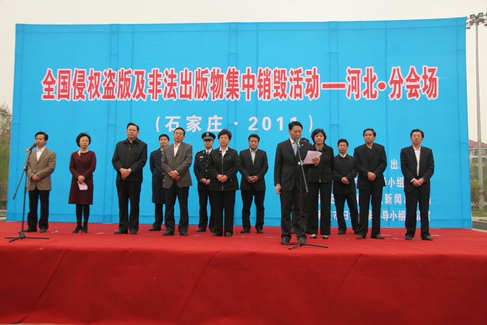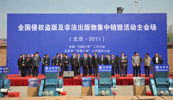 为迎接“4.26”世界知识产权日,倡导全社会形成尊重劳动、尊重创造、尊重知识的良好氛围,展示我国“扫黄打非”工作、打击侵权盗版、保护知识产权的重要成果,2011年4月22日上午10时,全国“扫黄打非”工作小组在全国31个省、自治区、直辖市同时举行了2011年侵权盗版及非法出版物集中销毁活动,并现场开展了以“拒绝盗版,做诚信公民”为主题的签名及发放绿书签活动。
