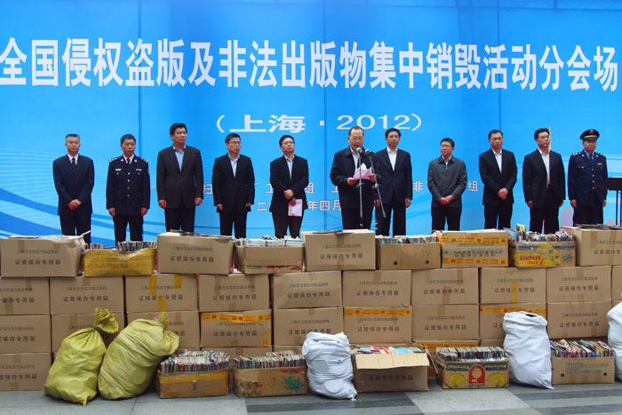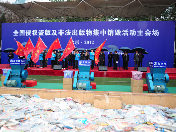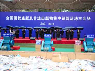 根据全国“扫黄打非”工作小组的统一部署,今天全国各省、自治区、直辖市“扫黄打非”工作领导小组同时举行2012年侵权盗版及非法出版物集中销毁活动。今天全国销毁的盗版图书、盗版音像制品、盗版电子出版物及非法报刊共计2900万件,其中在北京主会场销毁的达140万件。在每年“4.26”世界知识产权日前夕,举行全国性的侵权盗版及非法出版物集中销毁活动,充分展示了中国“扫黄打非”及打击侵权盗版工作的重要成果,进一步表明了中国政府保护知...