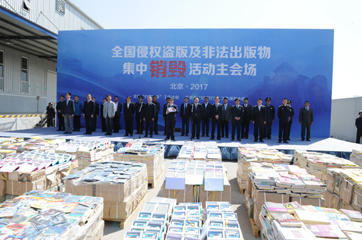 (各地大力查缴各类非法报刊、非法有害图书、音像制品及侵权盗版图书。图为2017年4月24日,全国统一举行集中销毁侵权盗版及非法出版物活动,北京主会场场景)