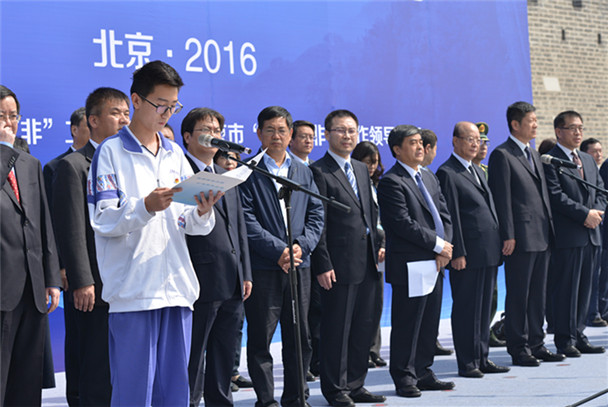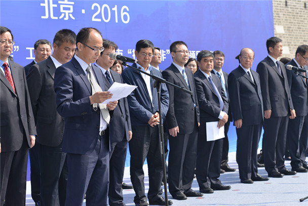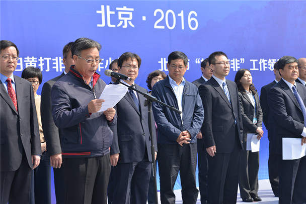 上午10时,全国31个省、自治区、直辖市同时开展2016年侵权盗版及非法出版物集中销毁活动。北京主会场活动地点位于永定门城楼前广场。图为国家新闻出版广电总局副局长、全国“扫黄打非”工作小组副组长兼办公室主任吴尚之主持北京主会场销毁活动。