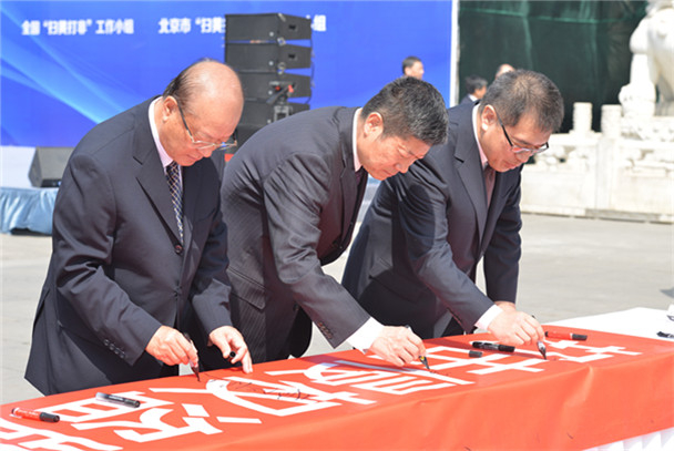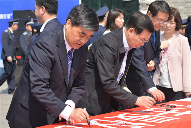 领导同志在“打击侵权盗版、保护知识产权”活动横幅上签字。